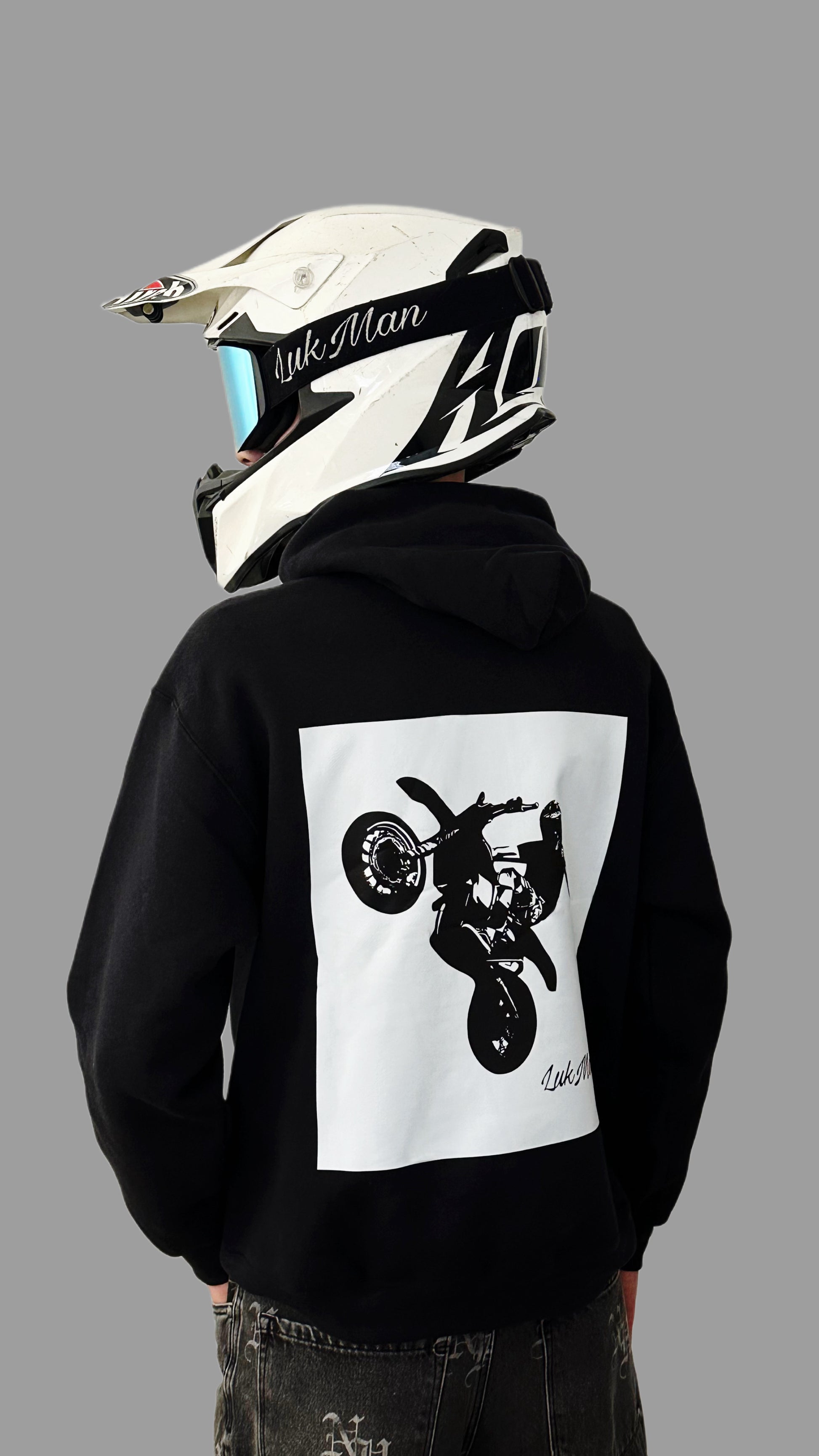 Introducing a high-quality and stylish moped hoodie that perfectly combines comfort and practicality. This hoodie is soft and comfortable to wear, making it the perfect choice for moped riding or casual leisure. A black hoodie with a striking white back print and elegant embroidery on the front.