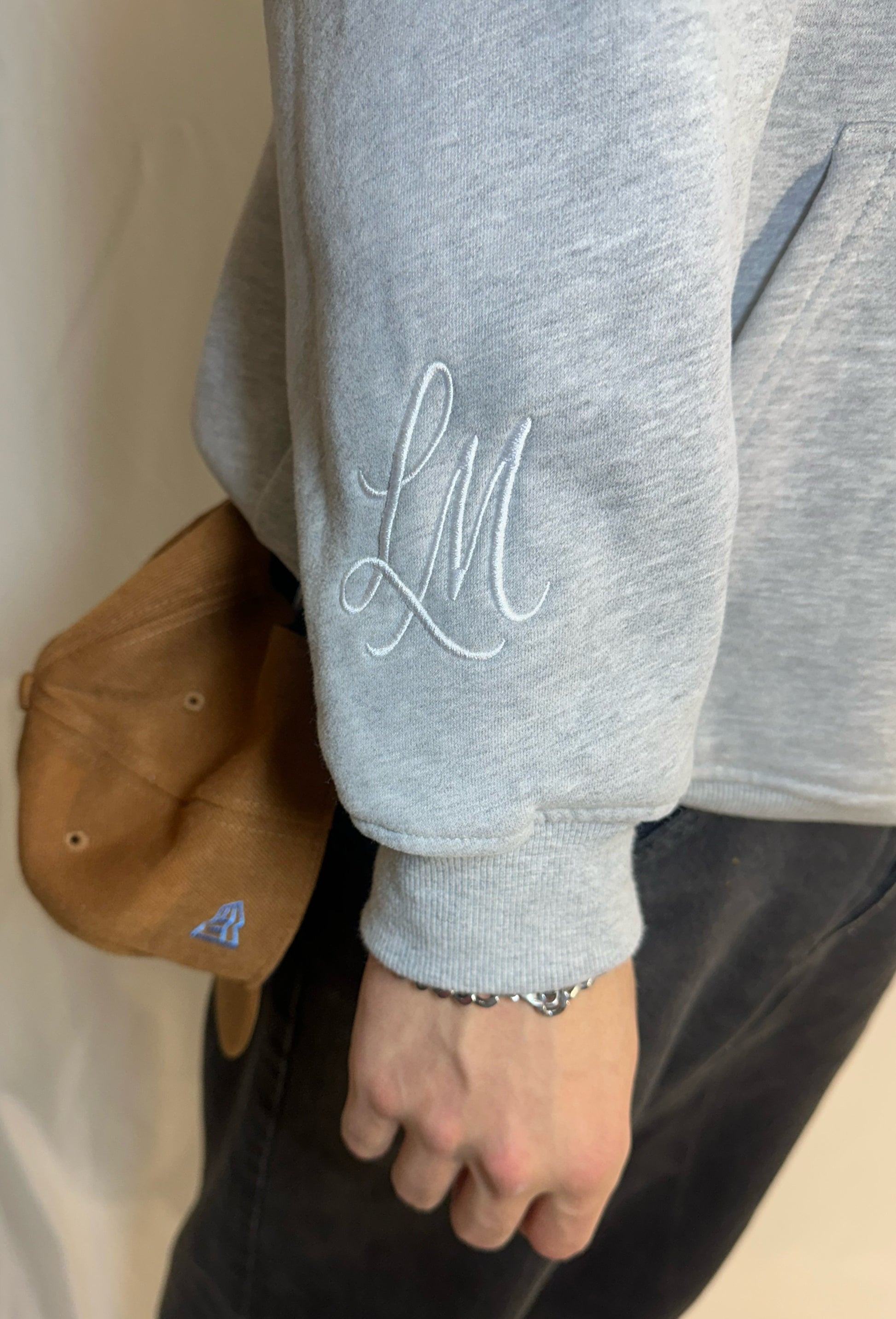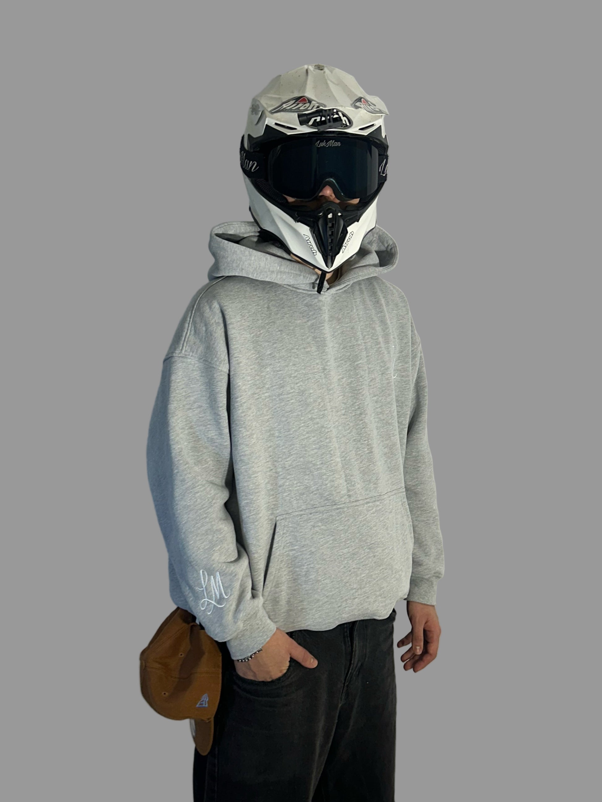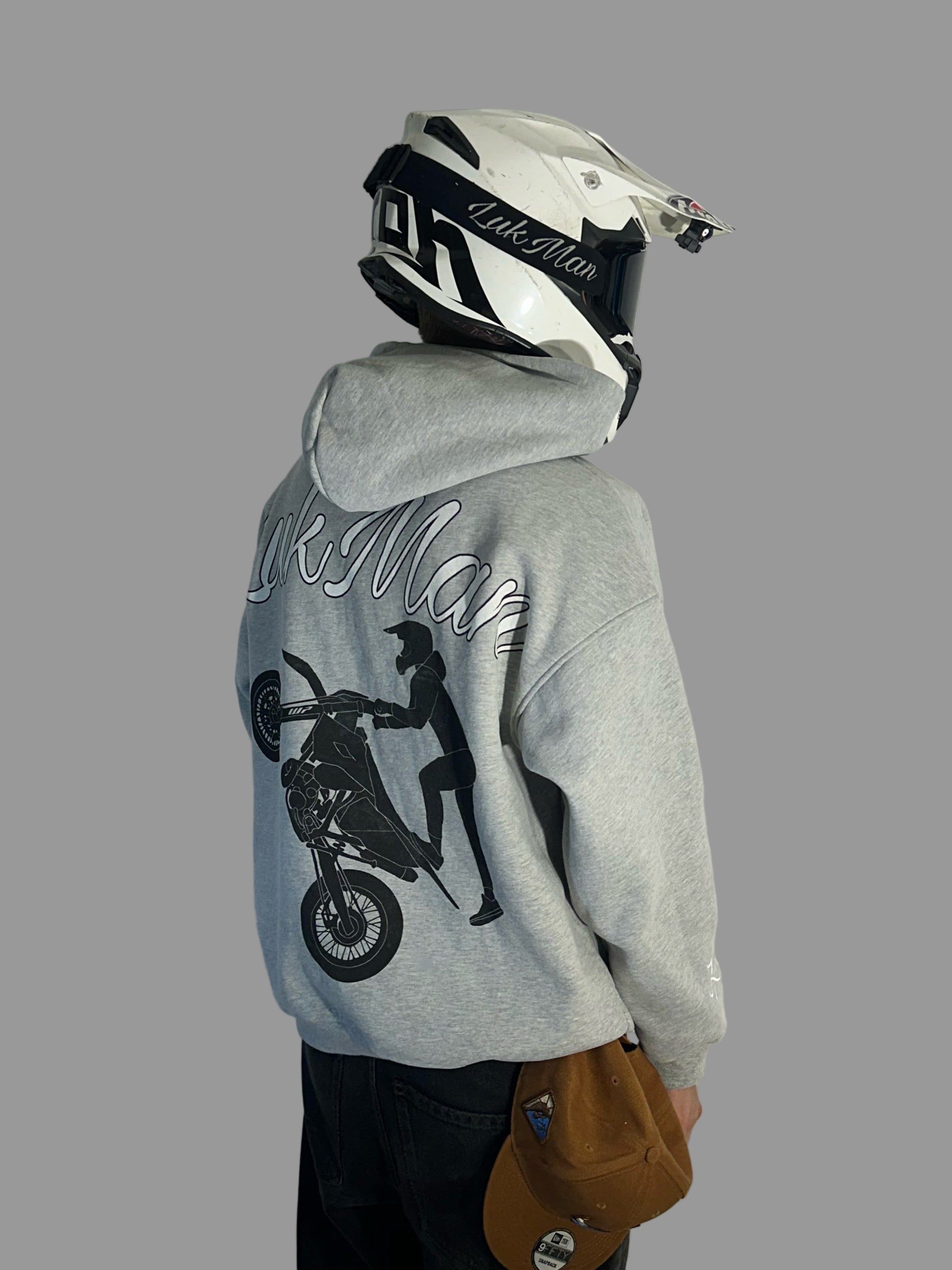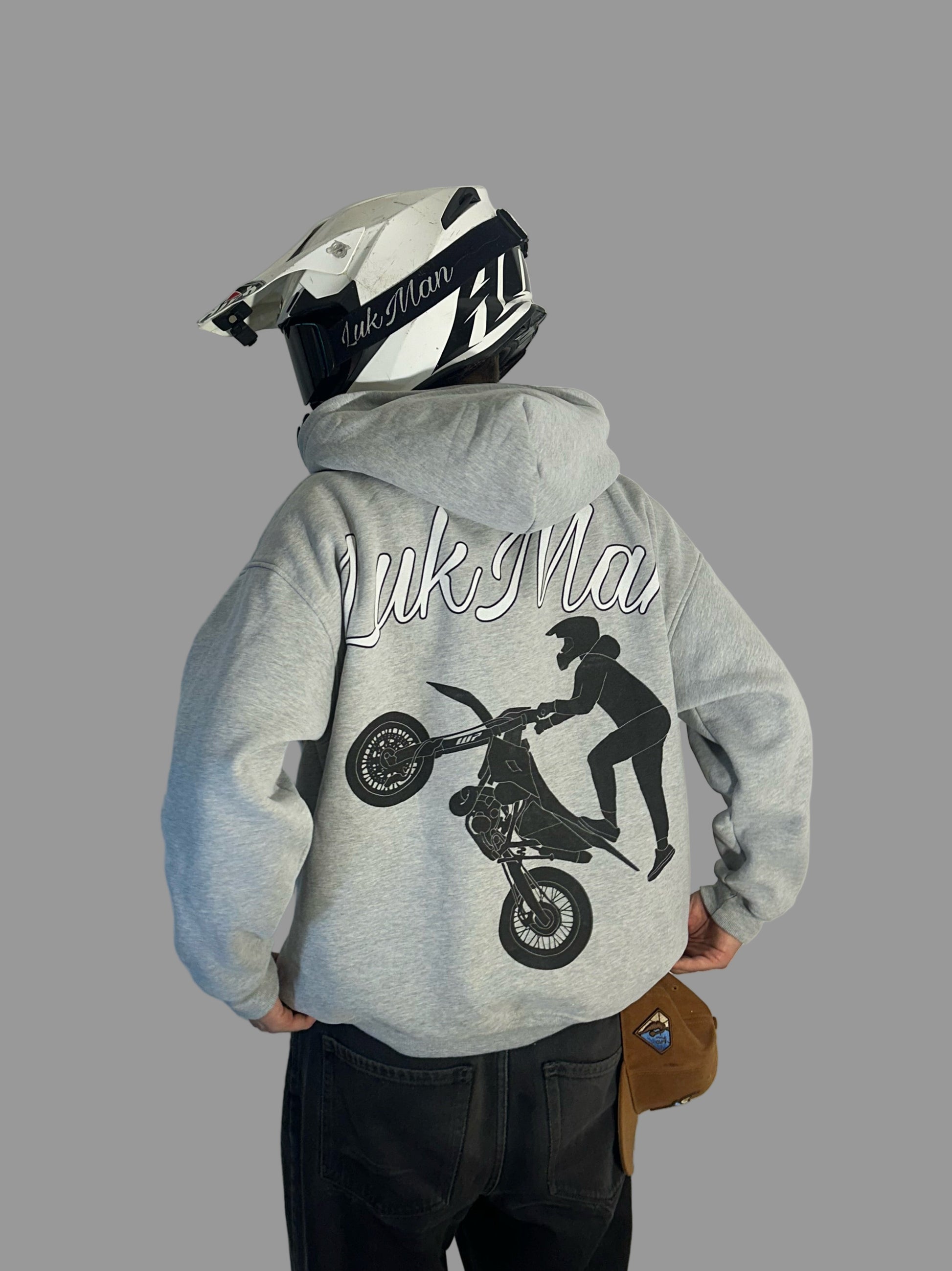 Harmaa huppari, jossa näyttävä selkäpainatus, sekä brodeeratut logot hihassa sekä rinnassa.